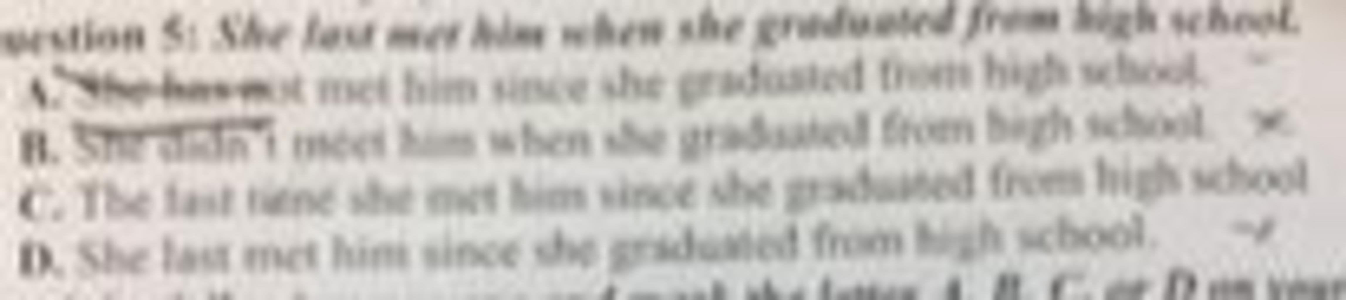 `->` Cô ấy đã không gặp anh ấy kể từ khi cô ấy tốt nghiệp trung học phổ thông.