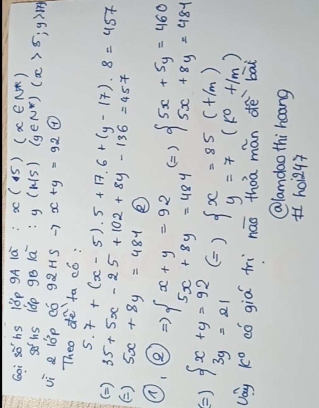 Vậy số học sinh của lớp `9A` là `85` học sinh và lớp `9B` là `7` học sinh