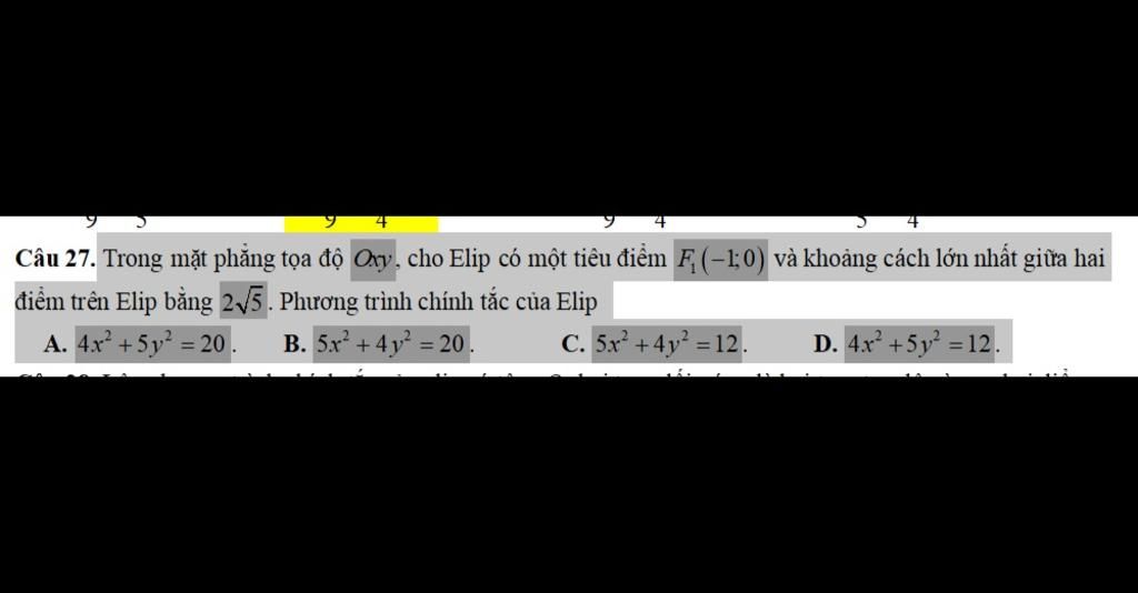 Câu 27. Trong mặt phẳng tọa độ Oxy, cho Elip có một tiêu điểm F(−1;0) và khoảng cách lớn nhất giữa hai
