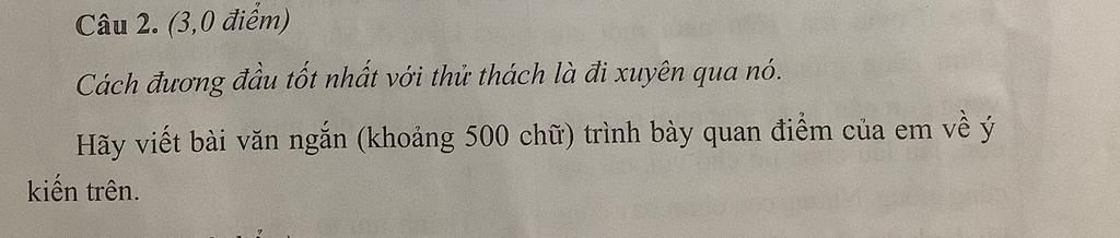 "Cách đương đầu tốt nhất với thử thách là đi xuyên qua nó". Thật vậy, trên con đường khám phá và hoàn thiện bản thân, con người phải trải qua những thách thức và cạm bẫy mà cuộc đời tạo ra. Khó khăn, thách thức chính là những cửa ải mở ra vô số những nghịch cảnh và việc của chúng ta chính là vượt qua và chinh phục những cửa ải ấy. Khi đối mặt với khó khăn, thử thách ta thường tỏ ra sợ hãi, nản chí và rồi dần bỏ cuộc, nhưng nếu chúng ta dũng cảm đói mặt và vượt qua nó, bạn sẽ học được cách vượt qua nỗi sợ. Đồng thời, ý chí và nghị lực của bạn cũng sẽ được nung rèn và tôi luyện trong suốt quá trình bạn vượt qua thử thách. Cùng nhờ vào đó mà hành trình tìm hiểu và hoàn thiện bản thân của bạn trở nên rõ ràng hơn. Bạn có thể hiểu hơn điểm mạnh và điểm yếu của mình, khám phá ra tiềm năng và năng lực của bản thân để đưa ra những hướng đi phù hợp. Khi vượt qua được những cạm bẫy, bạn sẽ trở thành một con người mới, mạnh mẽ và kiên cường hơn. Đội trưởng đội bóng đá nữ- Huỳnh Như là một ví dụ điển hình cho những người dám đương đầu với khó khăn. Diễn viên Anne Hathayway- nữ diễn viên bị ghét nhất nước Mĩ. Cô là một nữ diễn viên tài năng, nhưng vì định kiến về nhan sắc, hành động của xã hội nên cô không được mọi người công nhận. Cô đã cố gắng thay đổi và hoàn thiện bản thân mình hơn, vượt qua những sự ganh ghét và những rào cản mà xã hội mang lại, cô đã trở nên trưởng thành và trở thành một nữ diễn viên thành công trên màn ảnh nước Mĩ. Việc dám đương đầu với khó khăn, chính là biểu hiện của sự dũng cảm và qua đó ta cũng có được cái nhìn sâu sắc và bài học về giá trị khi ta vượt qua được thử thách. Tuy nhiên, không phải ai cũng có thể vượt qua thử thách, bởi vì họ sợ bước hụt ngay từ những bước đầu tiên. Ai cuxg phải đối mặt, trải qua khó khăn và chắc chắn sẽ có vấp ngã nhưng việc của bạn sẽ là đứng lên và bước những bước chăc chắn hơn hay sẽ nằm tại chỗ mình ngã và than oán cuộc đời. Tất cả nằm ở sự lựa chọn của bạn. Hãy nên nhớ trong từ điển của người thành công không có từ "sợ hãi".