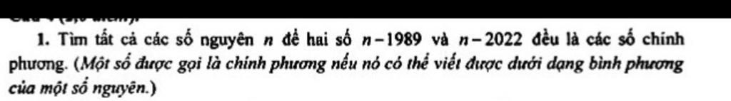 Khi đó `{(n-1989=a^2=17^2=289),(n-2022=b^2=16^2=256):}<=>n=2278(tm)`