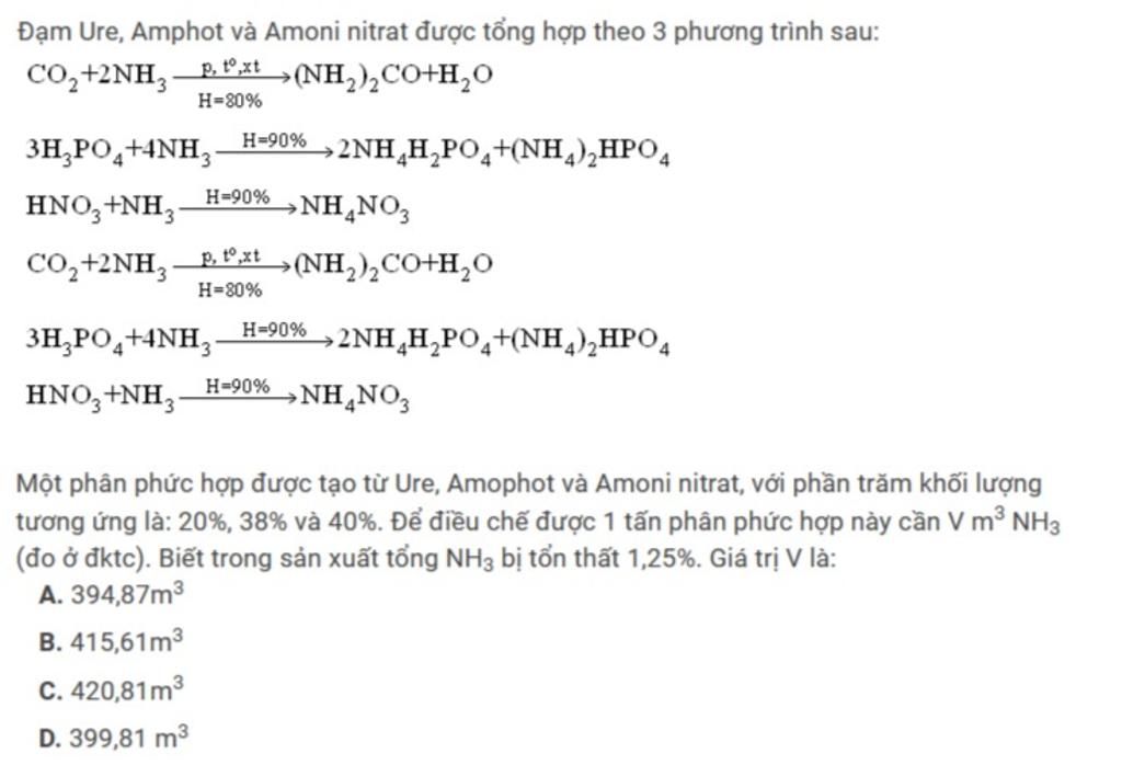 $V_{NH_3}(đktc)=\dfrac{\frac{167}{9}.22,4}{100\%-1,25\%}=420,9(m^3)$