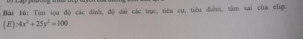 `@`Tiêu cự: `2c=2.\sqrt{a^{2}-b^{2}}=2.\sqrt{25-4}=2\sqrt{21}`