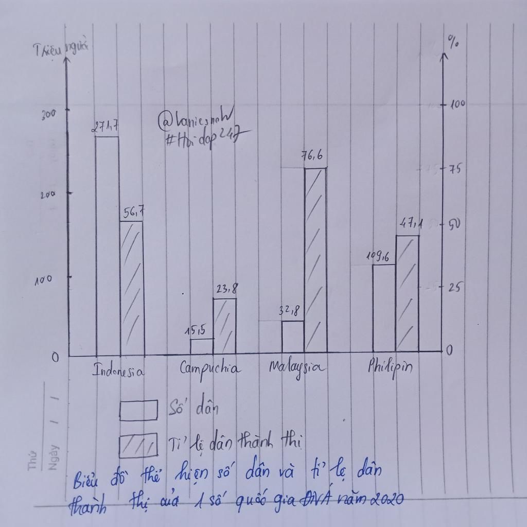 Hãy vẽ biểu đồ thích hợp nhất thể hiện số dân và tỉ lệ dân thành thị của các quốc gia trên