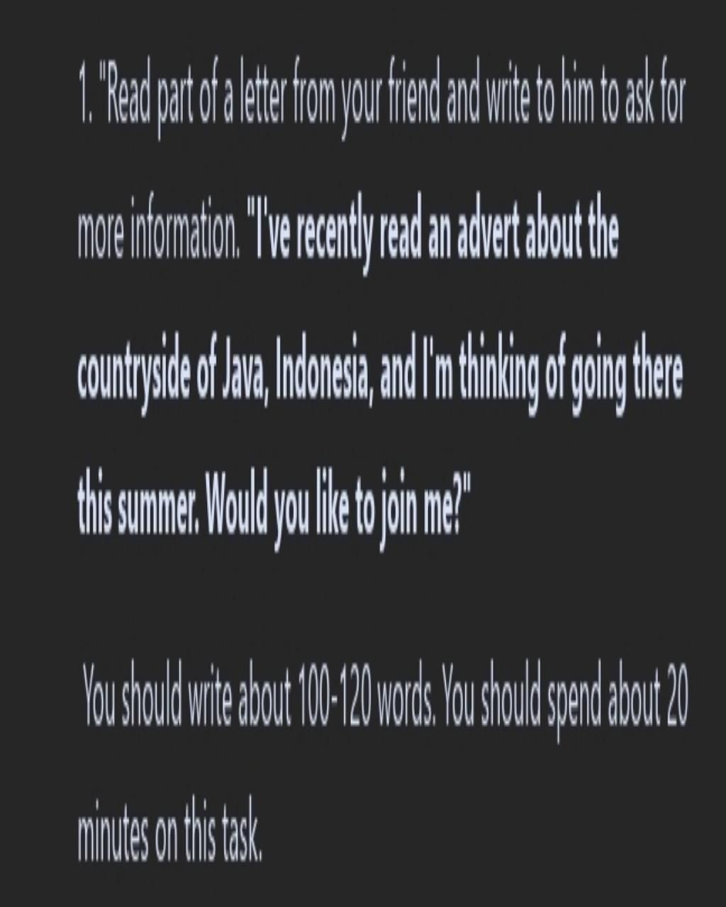 Hãy đọc một phần bức thư của bạn em và viết thư cho anh ấy để xin thêm thông tin. " gần đây tôi đã đọc một quảng cáo về nông thôn Java , Indonesia và tôi đang nghĩ đến việc đến đó vào mùa hè . Bạn có muốn tham gia cùng tôi không?