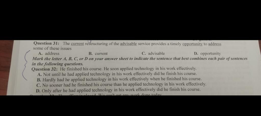 31. C -> advisory 32. C đảo ngữ no sooner had S V3/ed than S V2/ed