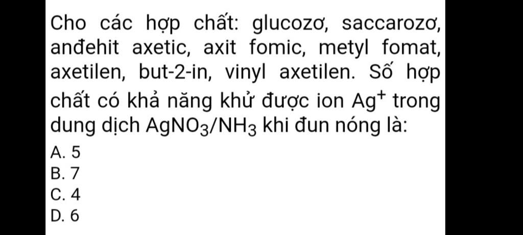 Cho các hợp chất: glucozơ, saccarozơ, anđehit axetic, axit fomic, metyl fomat, axetilen, but-2-in, vinyl axetilen. Số hợp chất có khả năng khử được ion Ag+ trong dung dịch AgNO3/NH3 khi đun nóng là: