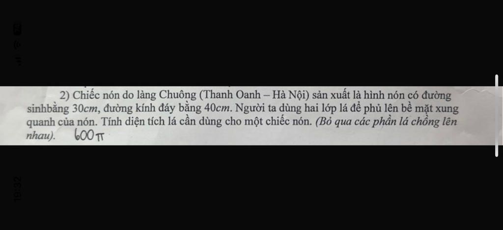 Vậy Diện tích lá cần dùng cho một chiếc nón là : `1200π`