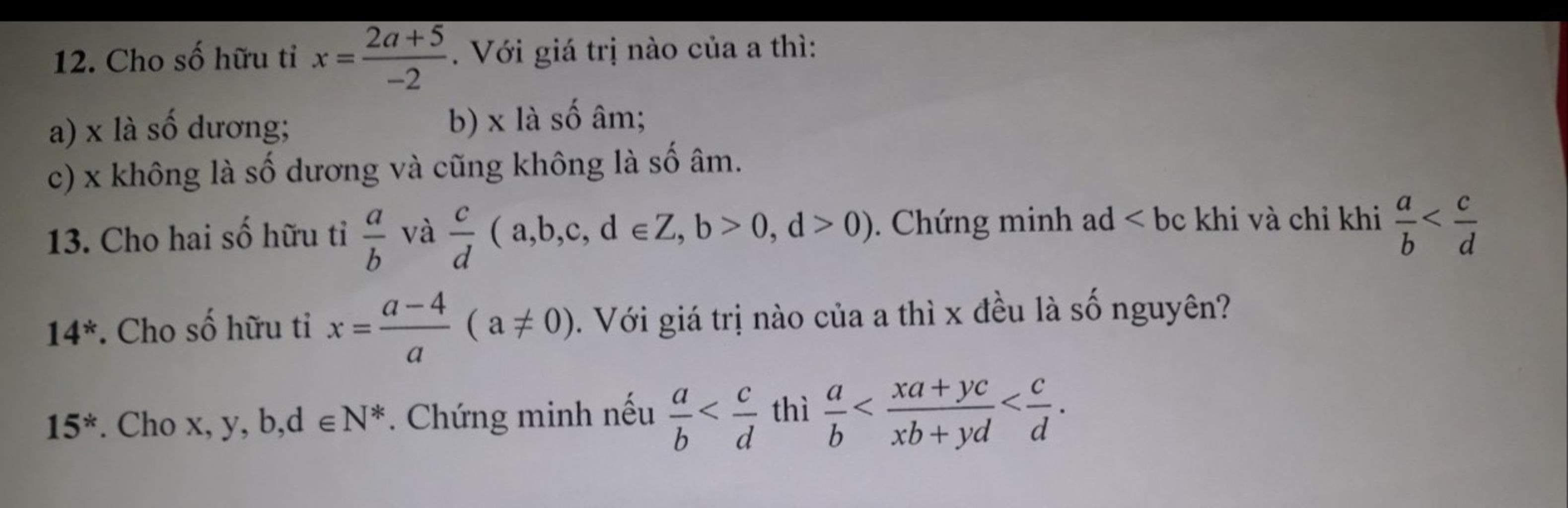 13. Nếu ad < bc ⇒ $\frac{ad}{bd}$ < $\frac{bc}{bd}$ ⇒ $\frac{a}{b}$ < $\frac{c}{d}$