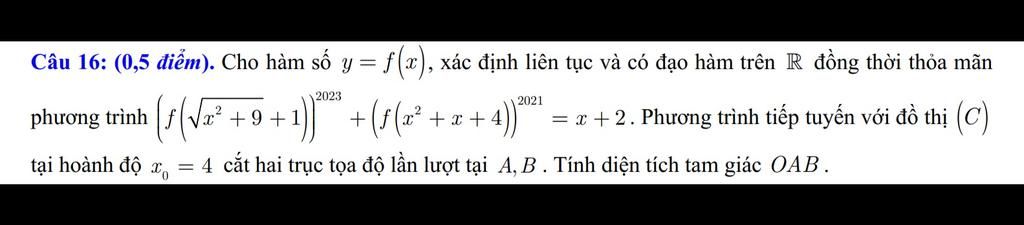 $\begin{array}{l} {\left[ {f\left( {\sqrt {{x^2} + 9} + 1} \right)} \right]^{2023}} + {\left[ {f\left( {{x^2} + x + 4} \right)} \right]^{2021}} = x + 2\left( * \right)\\ \left( * \right):x = 0 \Rightarrow f{\left( 4 \right)^{2023}} + f{\left( 4 \right)^{2021}} = 2\\ f\left( 4 \right) = u \Rightarrow {u^{2023}} + {u^{2021}} = 2\\ u\left( u \right) = {u^{2023}} + {u^{2021}},u \in \mathbb R \end{array}$