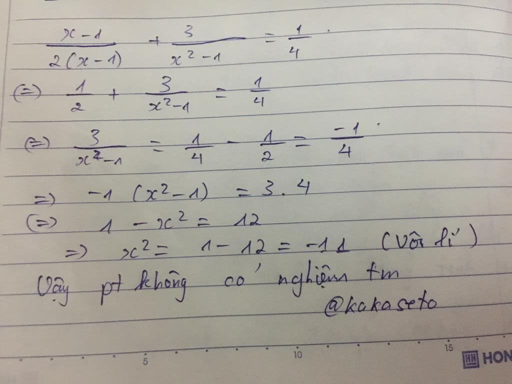 giải pt : x - 1 phần 2(x-1) + 3 phần x bình phương trừ 1 = 1/4