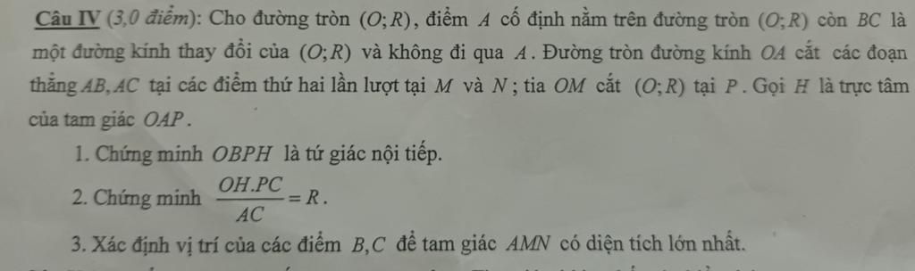Câu IV (3,0 điểm): Cho đường tròn (O;R), điểm 4 cố định nằm trên đường tròn (O;R) còn BC là