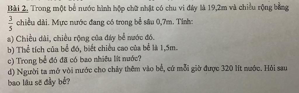 `c)` Thể tích nước trong bể là `:`