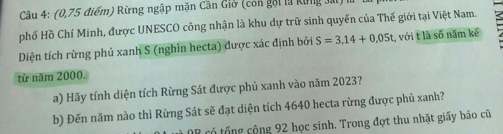 ⇒ `S = 3,14 + 0,05.23 = 4,29` `(` nghìn hecta `)`