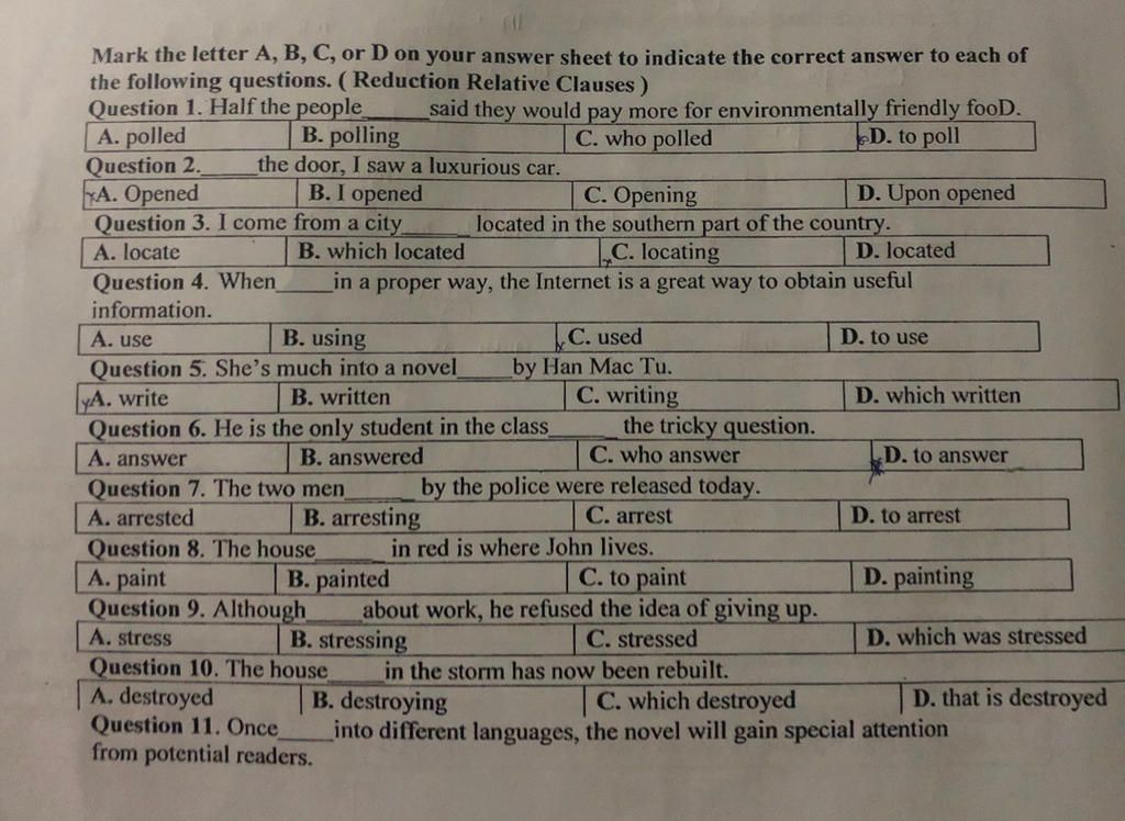 the following questions. (Reduction Relative Clauses)
