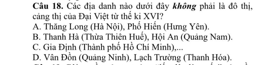 `-` Thăng Long, Phố Hiến, Thanh Hà, Gia Định đều là các đô thị, cảng thị thuộc Đại Việt từ thế kỉ XVI cho tới nay.