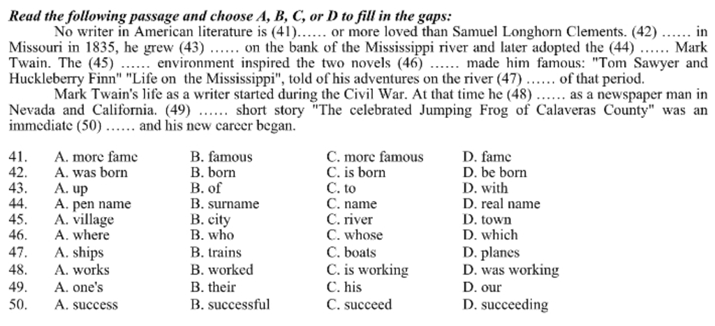 Missouri in 1835, he grew (43) ... on the bank of the Mississippi river and later adopted the (44) ... Mark ...