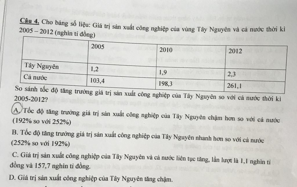 + Vì 1,92 < 2,53 `->` giá trị sản xuất công nghiệp của Tây Nguyên tăng chậm hơn so với giá trị sản xuất công nghiệp của cả nước `->` `A`