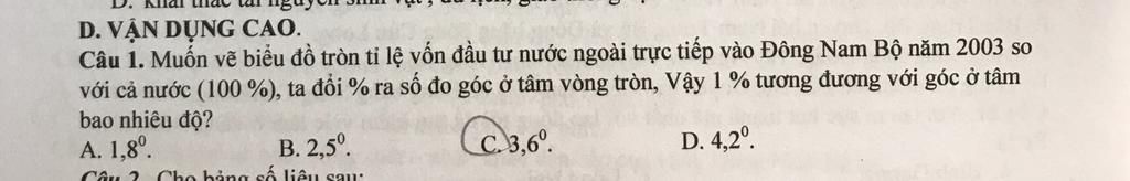 Câu 1. Muốn vẽ biểu đồ tròn tỉ lệ vốn đầu tư nước ngoài trực tiếp vào Đông Nam Bộ năm 2003 so