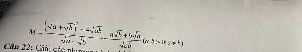 `M = ((sqrt{a} + sqrt{b})^2 - 4sqrt{ab})/(sqrt{a} - sqrt{b}) - (asqrt{b} + bsqrt{a})/(sqrt{ab})`