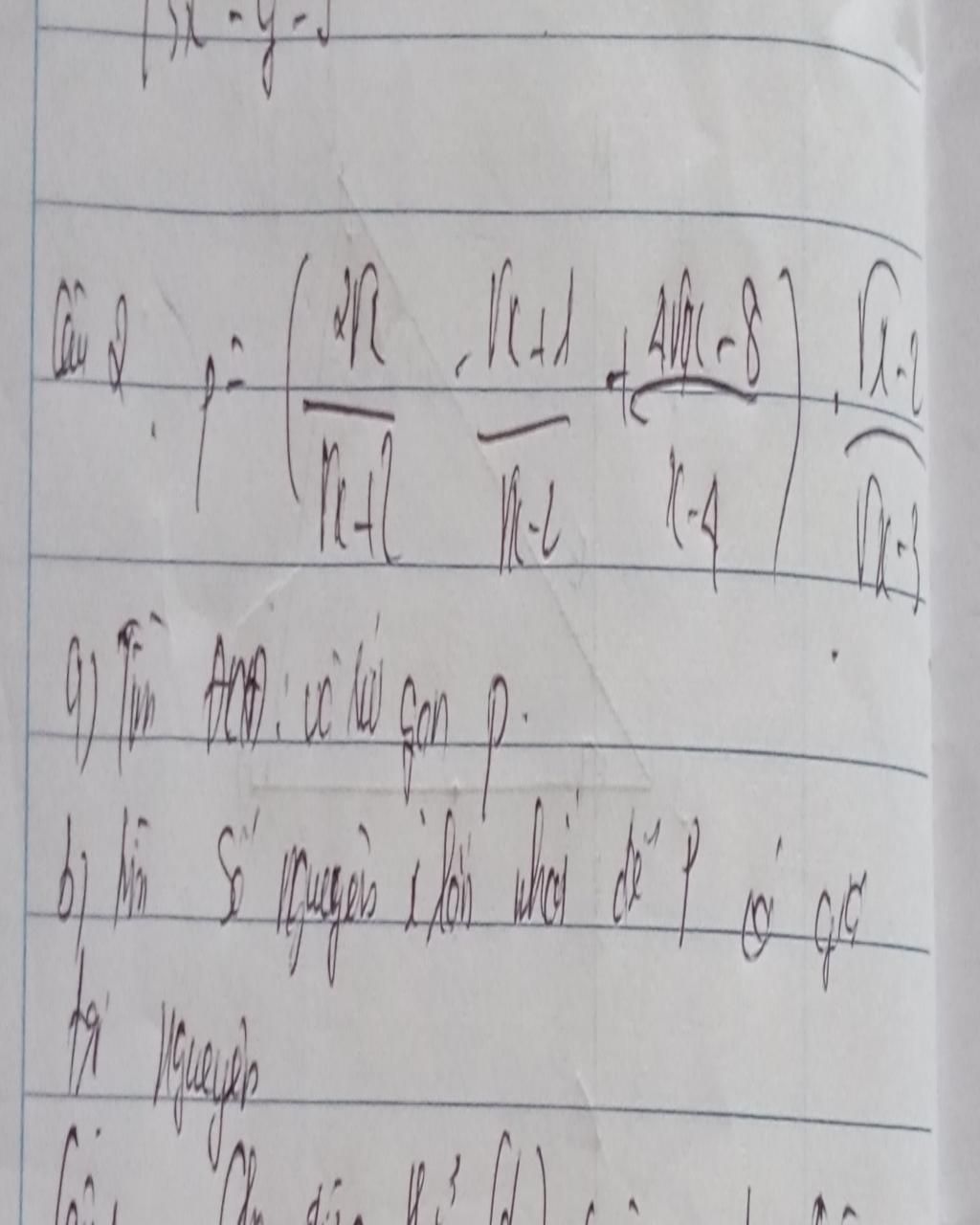 `P=({2sqrt{x}}/{sqrt{x}+2}-{sqrt{x}+1}/{sqrt{x}-2}+{4sqrt{x}-8}/{x-4}) . {sqrt{x}-2}/{sqrt{x}-3}`