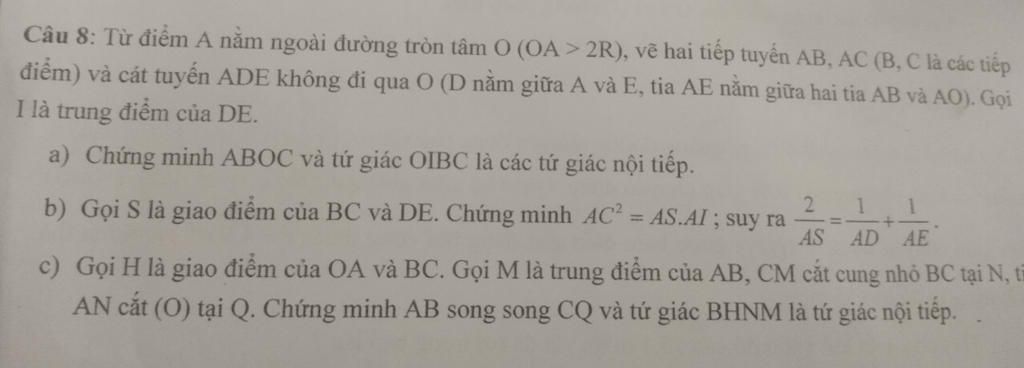 Câu 8: Từ điểm A nằm ngoài đường tròn tâm O (OA > 2R), vẽ hai tiếp tuyến AB, AC (B, C là các tiếp