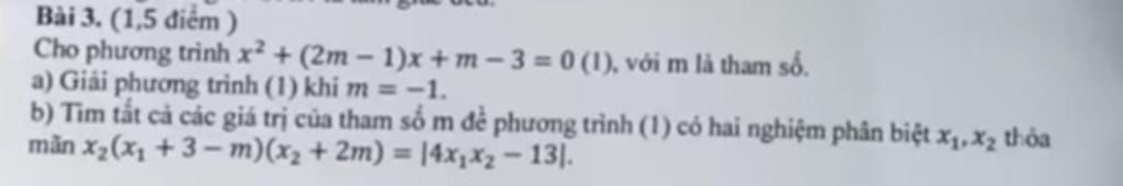 $Vi-et: x_1+x_2=1-2m\\ x_1x_2=m-3\\ \circledast x_2(x_1+3-m)(x_2+2m)=|4x_1x_2-13|\\ \Leftrightarrow x_2(x_1-x_1x_2)(x_2+2m-1+1)=|4x_1x_2-13|\\ \Leftrightarrow x_2(x_1-x_1x_2)[x_2-(x_1+x_2)+1]=|4x_1x_2-13|\\ \Leftrightarrow x_2(x_1-x_1x_2)(1-x_1)=|4x_1x_2-13|\\ \Leftrightarrow x_1x_2(1-x_2)(1-x_1)=|4x_1x_2-13|\\ \Leftrightarrow x_1x_2(x_1-1)(x_2-1)=|4x_1x_2-13|\\ \Leftrightarrow x_1x_2(x_1x_2-x_1-x_2+1)=|4x_1x_2-13|\\ \Leftrightarrow x_1x_2[x_1x_2-(x_1+x_2)+1]-|4x_1x_2-13|=0\\ \Leftrightarrow (m-3)[m-3-(1-2m)+1]-|4(m-3)-13|=0\\ \Leftrightarrow 3 m^2 - 12 m + 9 -|4 m - 25| =0 (*)\\ \circledast m < \dfrac{25}{4}\\ (*) \Leftrightarrow 3 m^2 - 12 m + 9 +(4 m - 25)=0\\ \Leftrightarrow 3 m^2 - 8 m - 16=0\\ \Leftrightarrow m=-\dfrac{4}{3};m=4 (TM)\\ \circledast m \ge \dfrac{25}{4}\\ (*) \Leftrightarrow 3 m^2 - 12 m + 9 -(4 m - 25)=0\\ \Leftrightarrow 3 m^2 - 16 m + 34=0\\ \Leftrightarrow m \in \varnothing$
