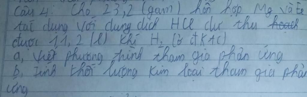 $\rm n_{H_2}=\dfrac{11,2}{22,4}=0,5(mol)\\Mg+2HCl\xrightarrow[]{}MgCl_2+H_2\\\\x\xrightarrow[]{}\xrightarrow[]{}\xrightarrow[]{}\xrightarrow[]{}\xrightarrow[]{}\xrightarrow[]{}\xrightarrow[]{}\xrightarrow[]{}\xrightarrow[]{}\xrightarrow[]{}x\\Fe+2HCl\xrightarrow[]{}FeCl_2+H_2\\y\xrightarrow[]{}\xrightarrow[]{}\xrightarrow[]{}\xrightarrow[]{}\xrightarrow[]{}\xrightarrow[]{}\xrightarrow[]{}\xrightarrow[]{}\xrightarrow[]{}\xrightarrow[]{}y\\Gọi:n_{Mg}=x(mol)\\n_{Fe}=y(mol)\\Ta có:24x+56y=23,2\\x+y=0,5\\\xrightarrow[]{}x=0,15(mol)\\y=0,35(mol)\\\xrightarrow[]{}m_{Mg}=0,15\times24=3,6(g)\\m_{Fe}=0,35\times56=19,6(g)$
