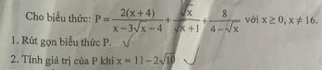 `P=\frac{2.(x+4)}{x-3\sqrt{x}-4}+\frac{\sqrt{x}}{\sqrt{x}+1}+\frac{8}{4-\sqrt{x}}`