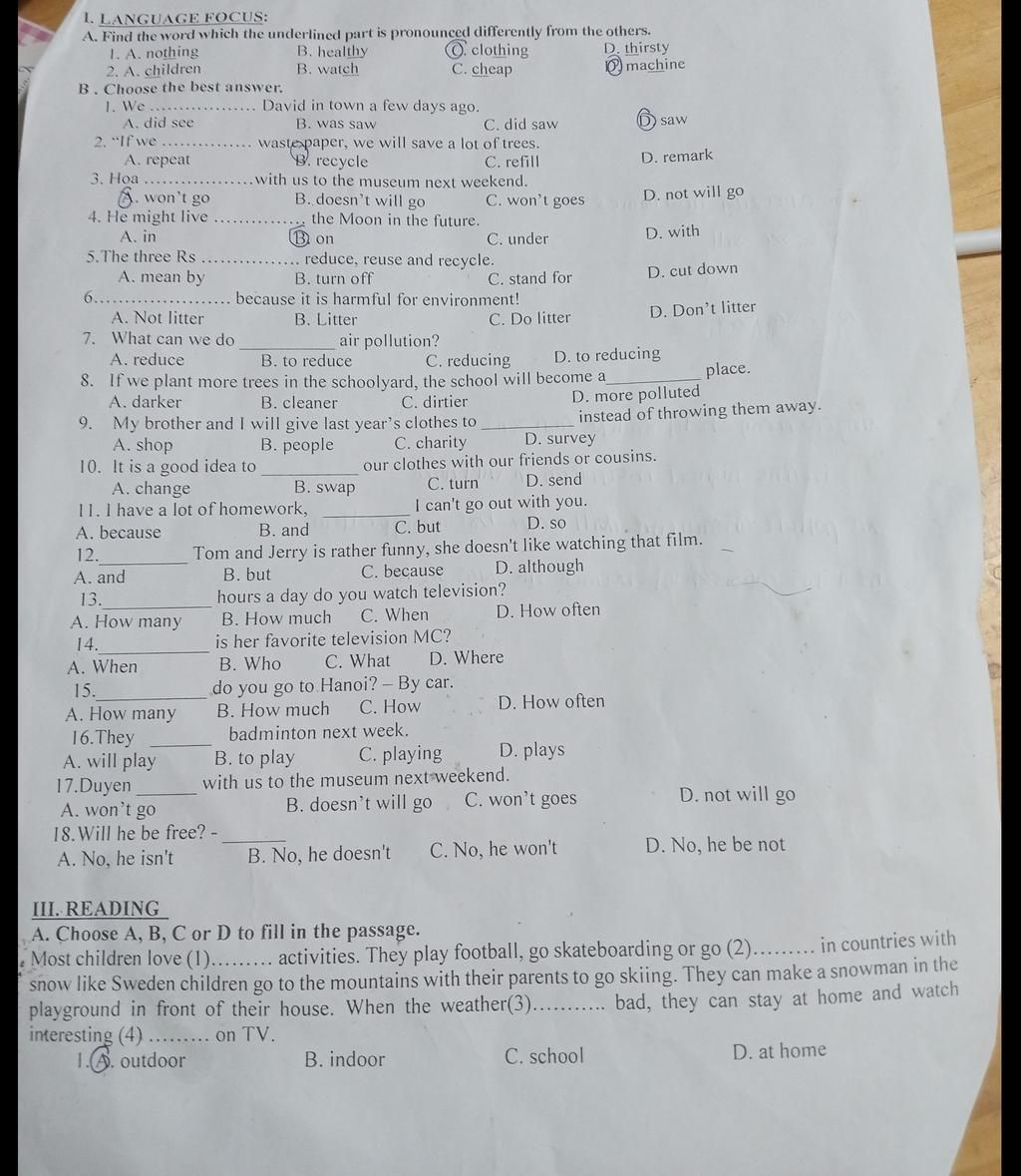 A. Find the word which the underlined part is pronounced differently from the others.