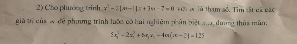 Vậy với $m = 4$ hoặc $m = \dfrac{47}{8}$ thì phương trình luôn có 2 nghiệm phân biệt $x_1, x_2$ dương thoả mãn $5x_1^2 + 2x_2^2 + 6x_1x_2 - 4m(m - 2) = 125$