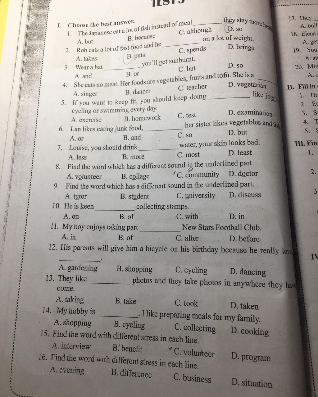 15. C.volunteer (tình nguyện viên) -> volunteer: trọng âm rơi vào âm tiết số3; còn lại rơi vào âm tiết số 1.