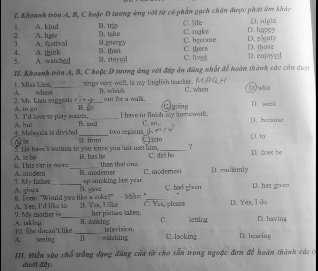 I. Khoanh tròn A, B, C hoặc D tương ứng với từ có phần gạch chân được phát âm khác