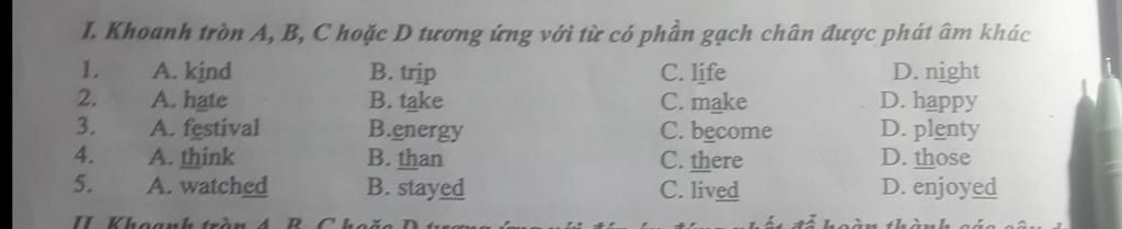 Câu 1 chọn B ( từ này phát âm là ɪ còn các đáp án còn lại đều phát âm là aɪ )