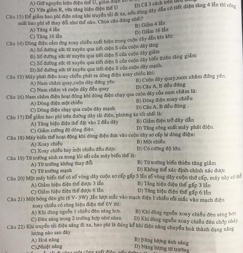 `->` Để giảm công suất hao phí là tăng hiệu điện thế truyền tải lên cao.