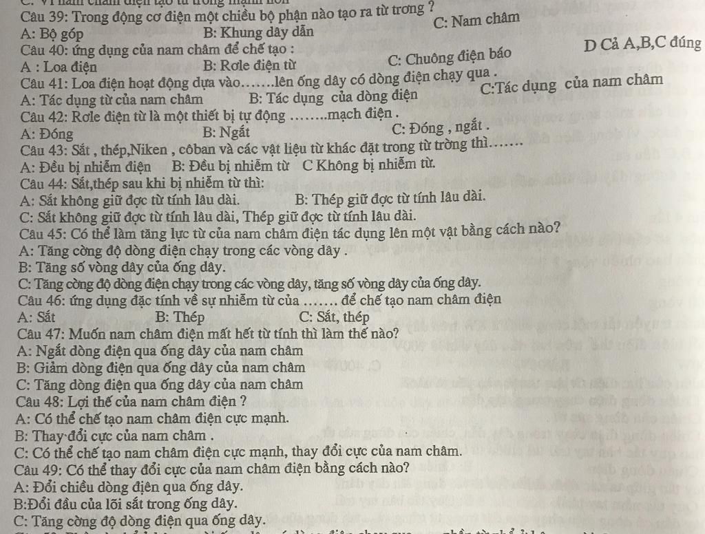 C39: Nam châm trong động cơ điện 1 chiều có tác dụng tạo từ trường.