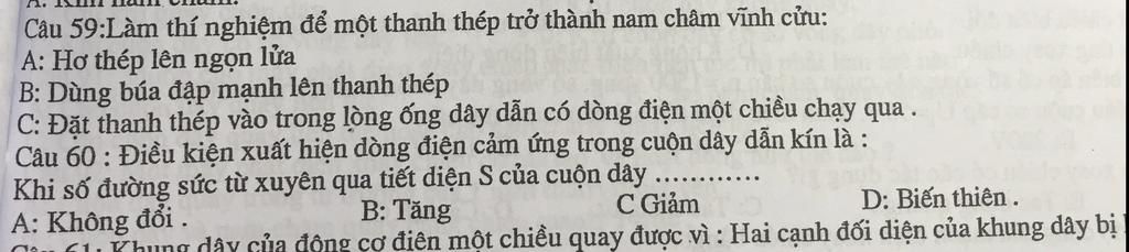 Câu 59:C.đặt thanh thép trong lòng ống dây dẫn có dòng điện một chiều chạy qua.