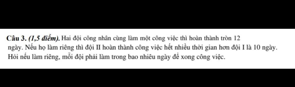 Gọi đội I làm tong số ngày để xong công việc nếu làm riêng là x ( ngày ) (0<x<12)(x∈N)