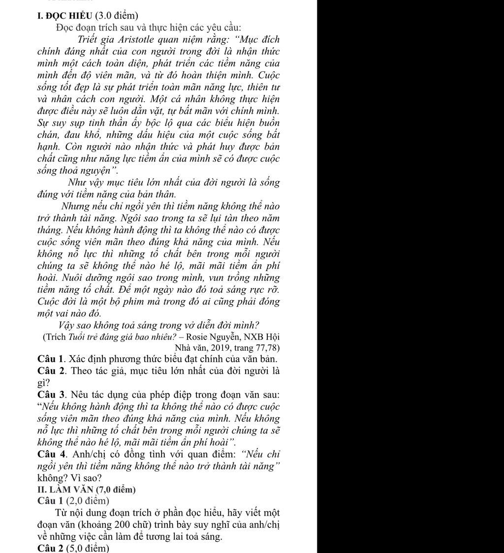 Câu 2 :Theo tác giả, mục tiêu lớn nhất của đời người là : sống đúng với tiềm năng của bản thân .