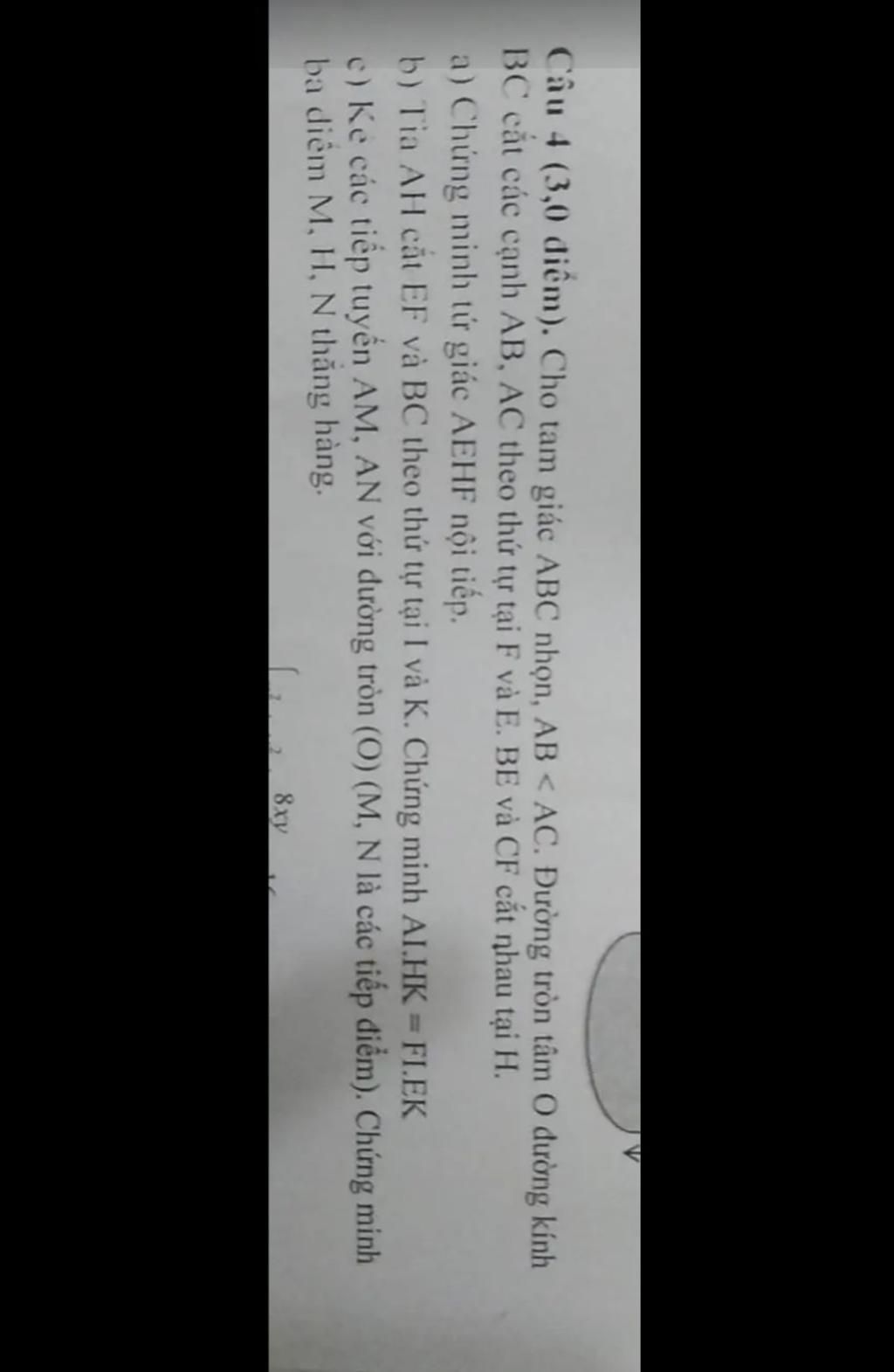 Xét $\Delta KFH,\Delta AKE$ có: $\widehat{KFH}=\widehat{KFC}=\widehat{KAC}=\widehat{KAE}$ và $\widehat{KEA}=180^o-\hat B=\widehat{FHK}$