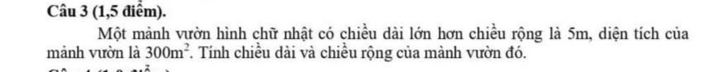 Vậy chiều rộng mảnh vườn hình chữ nhật là `15 m` và chiều dài mảnh vườn hình chữ nhật là `15+5=20 m`