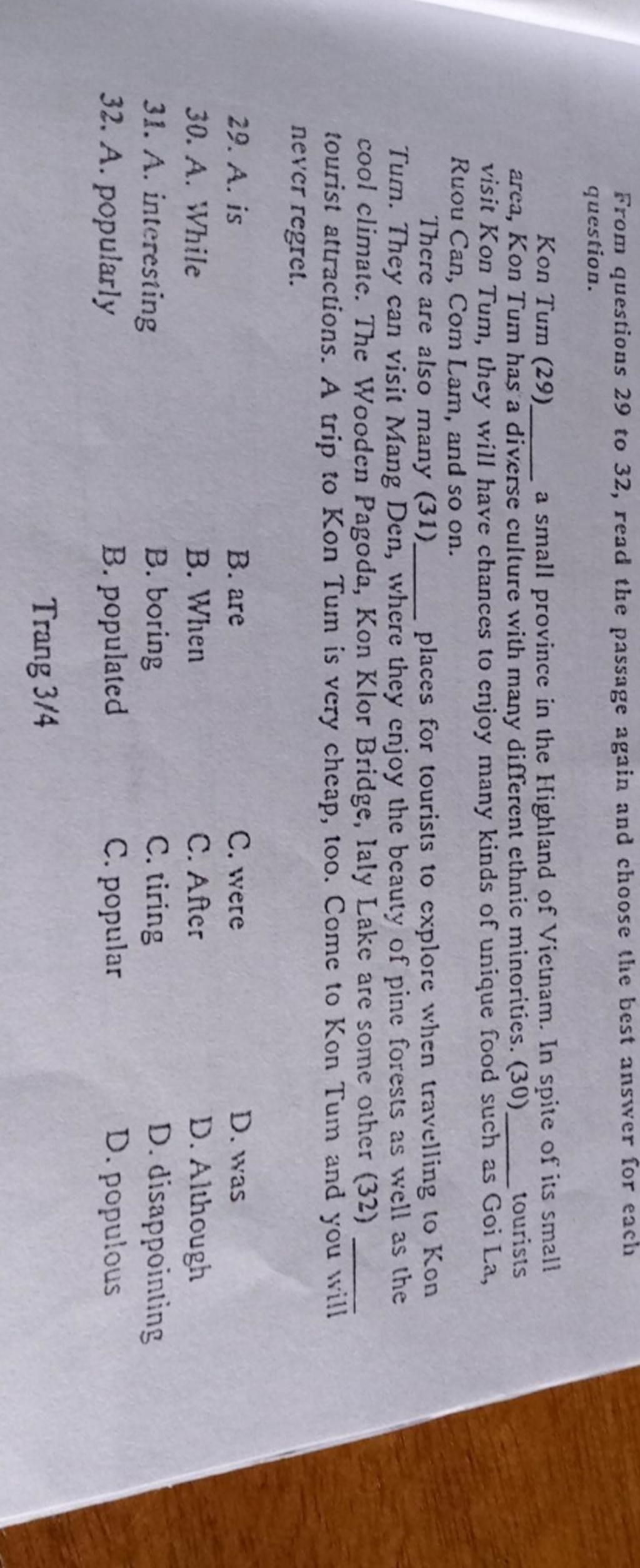 `-` Dựa vào ngữ cảnh : "______ khách du lịch thăm Kon Tum , họ sẽ có cơ hội để tận hưởng những lại thức ăn độc đáo như là Goi la , Ruou Can , Com Lam và nhiều món hơn thế nữa"
