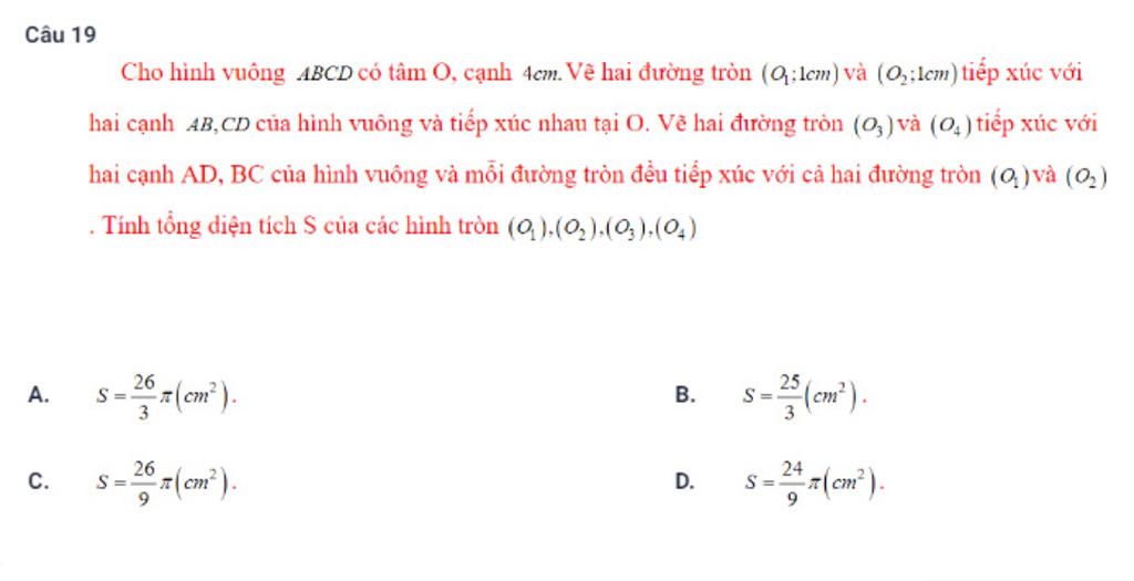 Cho hình vuông ABCD có tâm O, cạnh 4cm. Vẽ hai đường tròn (Q:lem)và (O,;1cm) tiếp xúc với