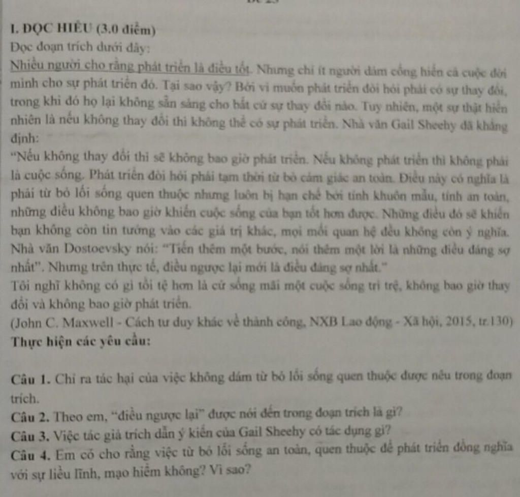 Câu 3: Muốn nói đến tác hại của việc "không thay đổi". Nếu không thay đổi thì con người sẽ không phát triển, không vươn xa được trong tương lai. Để rồi cuộc sống sẽ dần trở nên vô vị, không có ý nghĩa gì. Và nếu con người chỉ sống trong "vòng an toàn" mà không dám nói không dám làm, không dám thay đổi, phá vỡ giới hạn của bản thân mà chỉ đứng yên một chỗ, không dám hành động thì đó là "điều đáng sợ nhất". Và hơn cả là muốn kuyên mỗi người chúng ta rằng càng hành động, thay đổi suy nghĩ, dám nghĩ dám làm để bứt phá, để đạt được thành công.