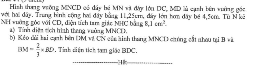 với hai đáy. Trung bình cộng hai đáy bằng 11,25cm, đáy lớn hơn đáy bé 4,5cm. Từ N kẻ