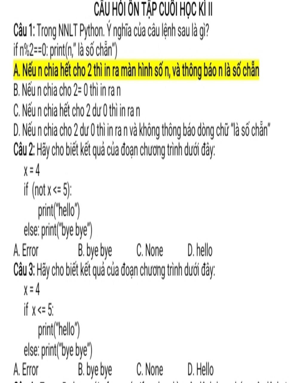 Câu 1: A. Nếu n chia hết cho 2 thì in ra màn hình số n, và thông báo n là số chẵn