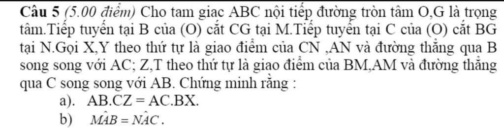 Câu 5 (5.00 điểm) Cho tam giac ABC nội tiếp đường tròn tâm O.G là trọng