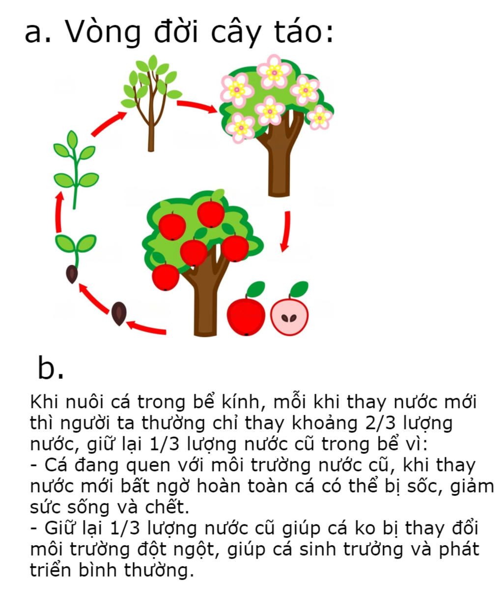 b, Vì khi nuôi cá trong bể kính, mỗi khi thay nước cần phải giữ lại khoảng 1/3 lượng nước cũ vì cá hay hô hấp, sinh sống trong môi trưởng nước kiểu đó, nhiệt độ như vậy. Nếu tự nhiên đột ngột thay đổi sẽ khiến cá phải thay đổi nhiệt độ, lượng nước quen thường ngày. Vì vậy sẽ dẫn đến việc cá sẽ dễ chết.