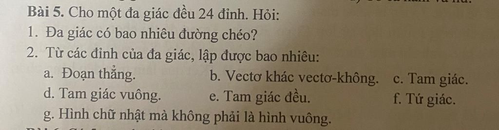 1,2a,số đỉnh của đa giác là 24 nên khi ta lấy 2 điểm bất kỳ để vẽ đường thẳng thì ta tạo đc 24!/2!22!=276 đường thẳng mà số đường thẳng đó = số đường chéo + cạnh của đa giác nên số đường chéo là 276-24=252