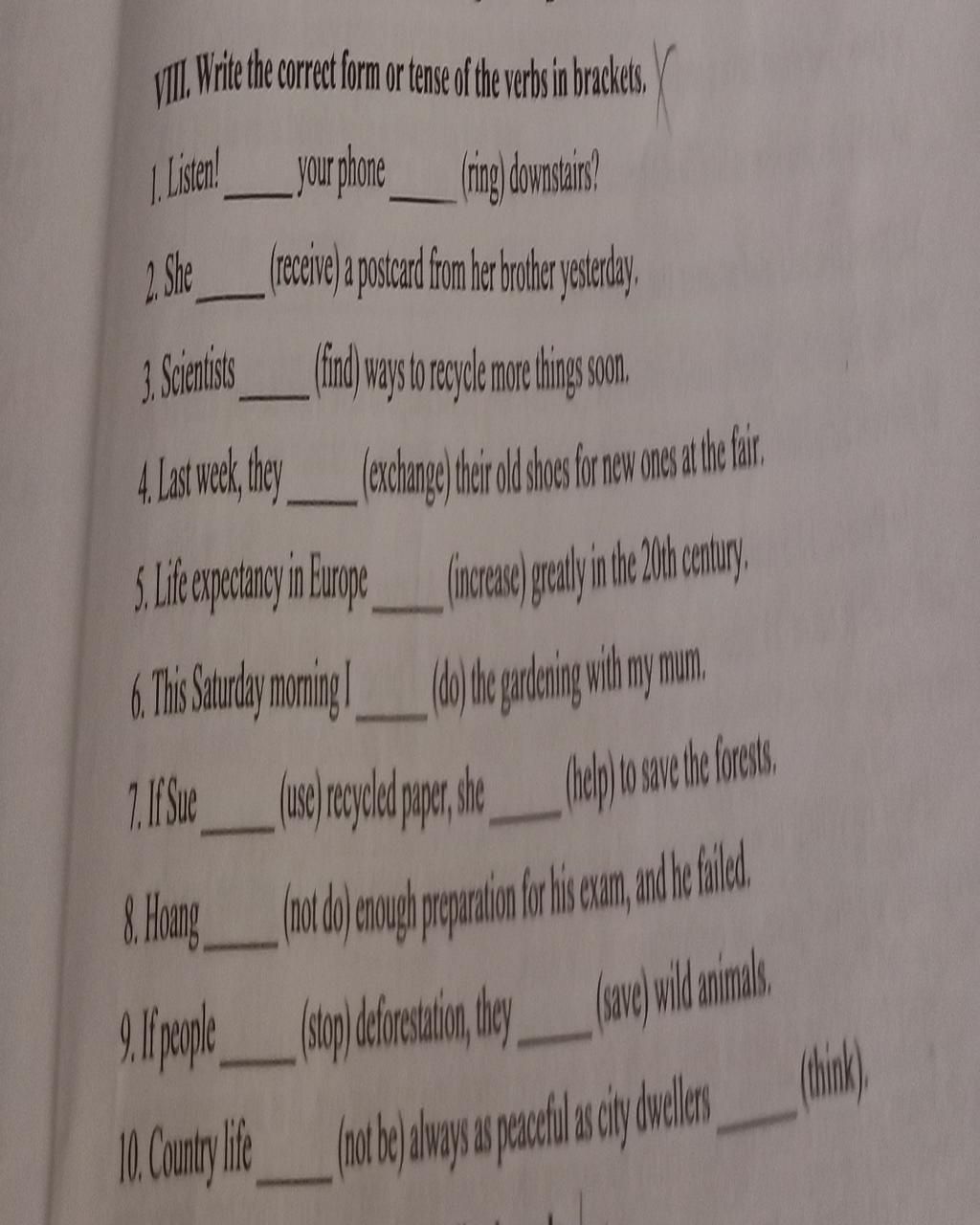 VIII. Write the correct form or tense of the verbs in brackets.